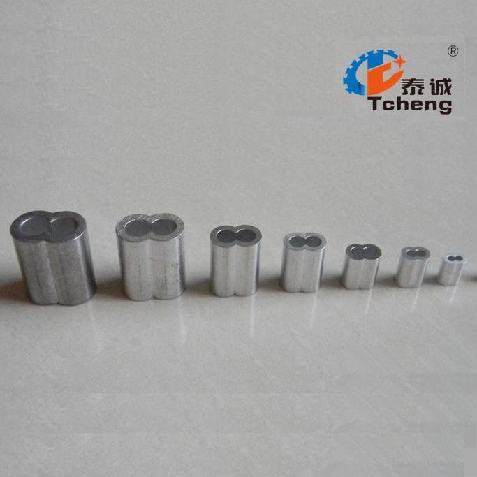 鋼絲繩鋁套—鋁套是鋁材質(zhì)的,較輕,用來(lái)固定鋼絲繩兩端的頭的,鋼絲繩根據(jù)需要的掛圈大小,插入鋁套,然后放入壓套機(jī)模具內(nèi),(根據(jù)鋁套型號(hào)對(duì)應(yīng)壓套機(jī)模具,模具型號(hào)跟鋁套型號(hào)都是標(biāo)準(zhǔn)尺寸),壓制完,把兩邊擠壓出來(lái)的鋁廢料清理掉,一根鋼絲繩完成!